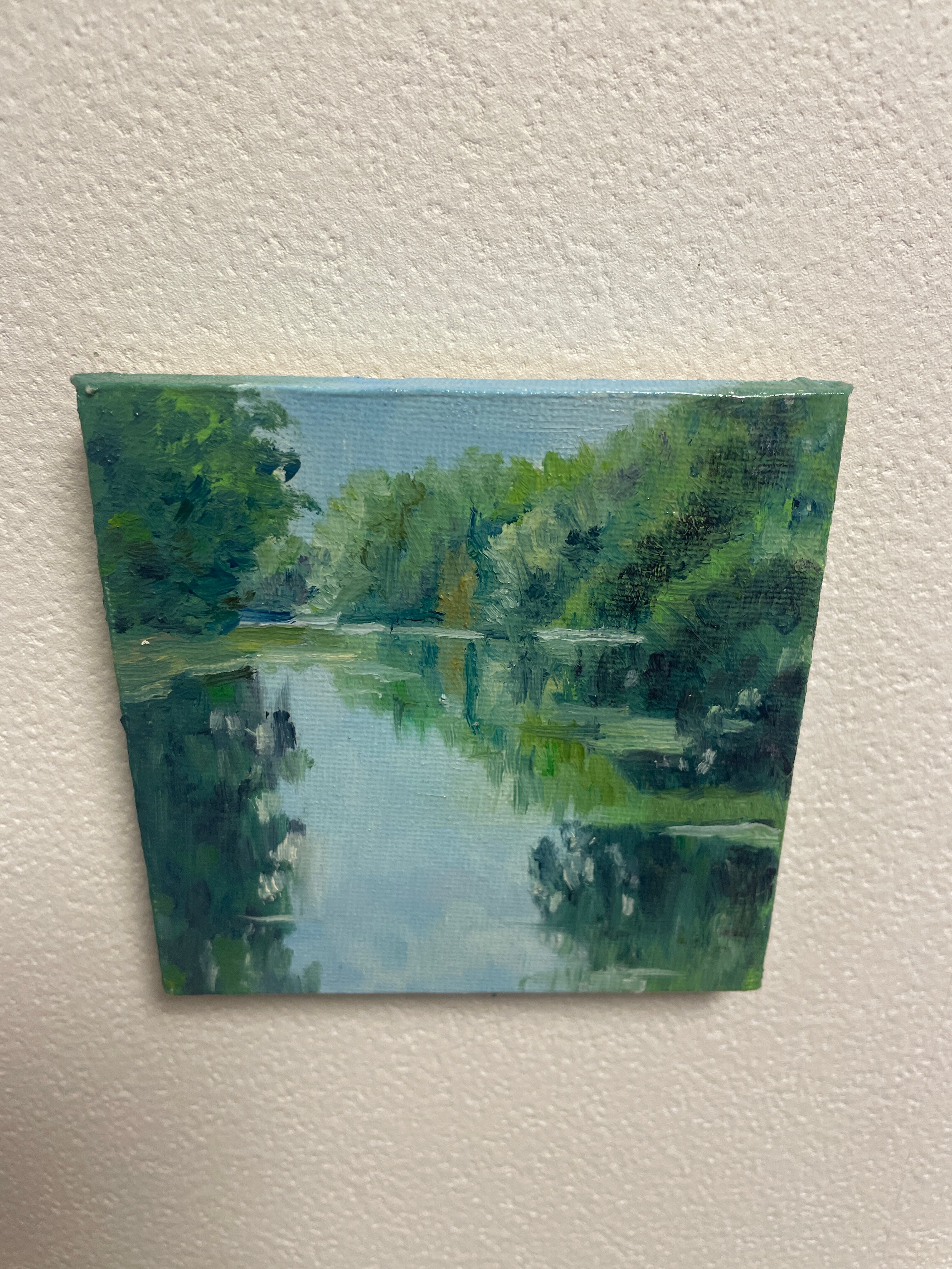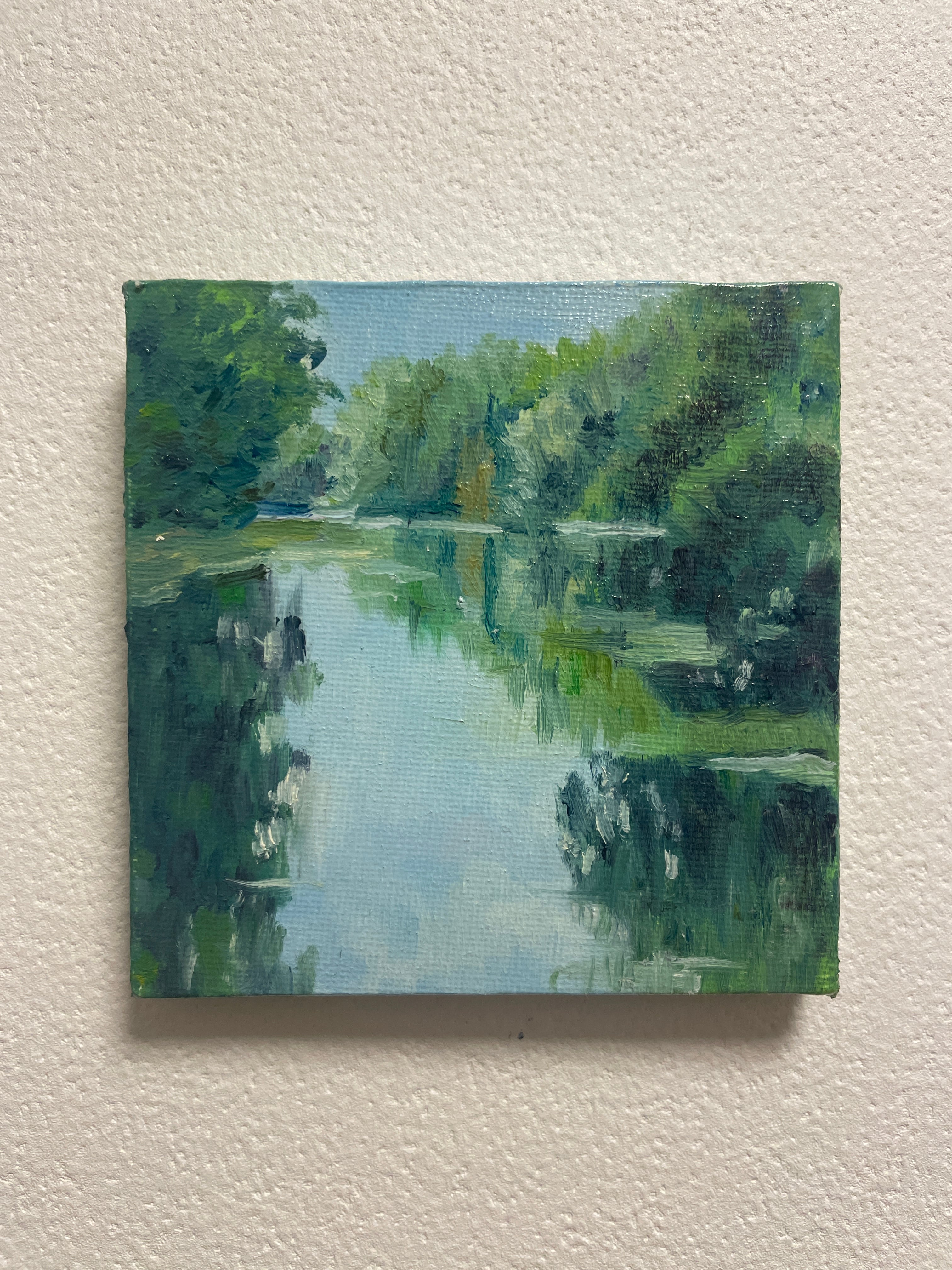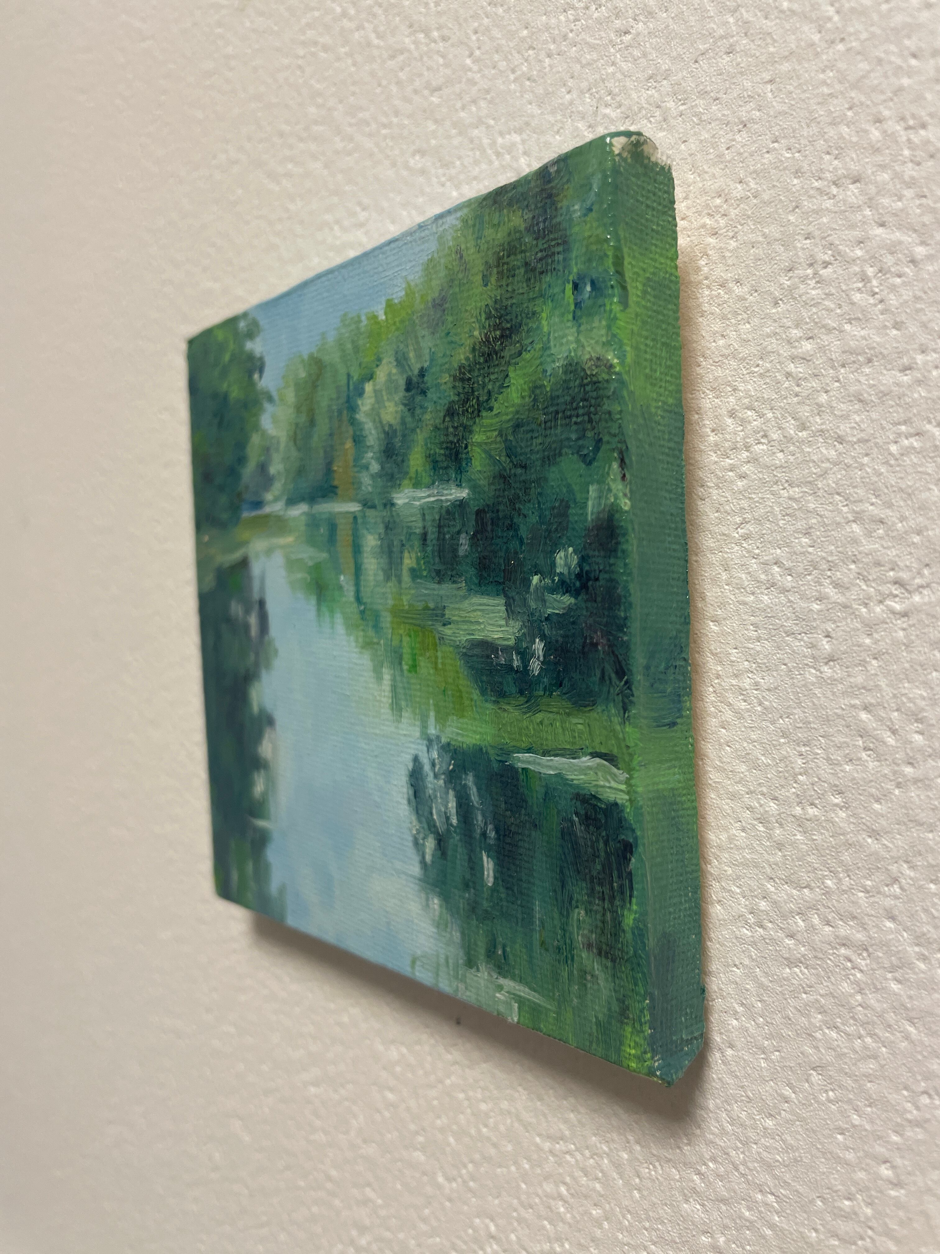 色彩は瑞々しい緑と淡い青を基調とし、光を含んだ水面が視線を奥へと導きます。場所を特定しない風景でありながら、どこか懐かしさを感じさせ、見る人それぞれの記憶や心情にそっと寄り添う作品です。小さな画面の中に、深い静寂と安らぎが封じ込められています。